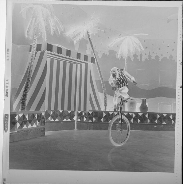 Curator: This photograph, “Untitled (chimp performing tricks on unicycle)” by Jack Gould, presents a curious scene. The composition centers around the chimp on a unicycle against a backdrop of palm trees and a tent. What strikes you first about this piece? Editor: The immediate impression is one of controlled absurdity. The stark contrast between the animal's natural state and its contrived performance creates a palpable tension. It speaks to the spectacle of animal exploitation, doesn't it? Curator: Indeed. The composition employs a clear visual hierarchy, placing the chimp as the focal point. The interplay of geometric shapes in the set design, the triangles and stripes, further emphasizes the artificiality of the scene. Editor: And the black and white medium underscores the historical context. Circuses and animal acts were pervasive forms of entertainment, reflecting a specific cultural attitude toward animals and entertainment that can be traced through art and media history. Curator: Looking closely, the textures are also important: the soft fur of the chimp against the hard metal of the unicycle creates a subtle yet powerful contrast. I think Gould is interested in this formal distinction. Editor: Absolutely, and understanding this image involves acknowledging its place within broader societal structures. Considering the politics of display enriches our interpretation beyond mere formalism. Curator: A compelling point. Examining these elements has added layers to our understanding. Editor: Yes, together these perspectives show us that the photograph functions as more than just an oddity.
