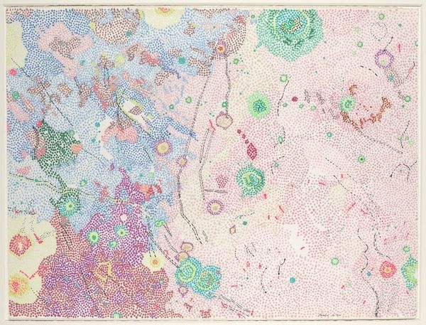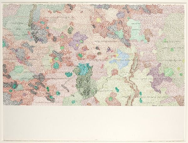Curator: Oh, what a delightful find! Here we have Nancy Graves’s 1972 drawing, "Geological Map of the Sinus Iridum Quadrangle of the Moon." Quite a mouthful, isn't it? Editor: It’s breathtaking in its intricacy! So delicate, almost dreamlike... It looks like pointillism meets cartography of outer space. I feel like I'm peering through a telescope with rose-tinted lenses. Curator: Rose-tinted, exactly! Notice how she uses these tiny, meticulously placed dots to construct this lunar landscape. The colors seem both scientific and fantastical, quite like how early astronomers portrayed space! Editor: And the circular shapes... Do you think each one represents a crater? Are they symbols of cosmic events or impact, perhaps? There's a profound history embedded here. The Moon, mythologically speaking, represents cycles, emotion, and the subconscious mind. Curator: Fascinating observation. Graves’ work often blurred the line between science and art. It's as if she's not just mapping a physical place, but also the human desire to explore and understand it, with each color encoding a certain data, almost. She loved her charts! Editor: Definitely! There is abstraction at play. Although technically a map, Graves isn’t just conveying location. She layers meaning by using this dot matrix, encoding cultural meaning—what stories and concepts we humans apply when trying to describe something like the moon. It feels symbolic of the mind itself—all these tiny associations, swirling, creating meaning. Curator: Absolutely. It reminds me that even the most factual things are filtered through our imaginations, turned into stories, aren’t they? Editor: This lunar drawing serves as a potent reminder that exploration, be it physical or intellectual, transforms both the explorer and the explored. Curator: So very well put. I will be thinking of that for ages.