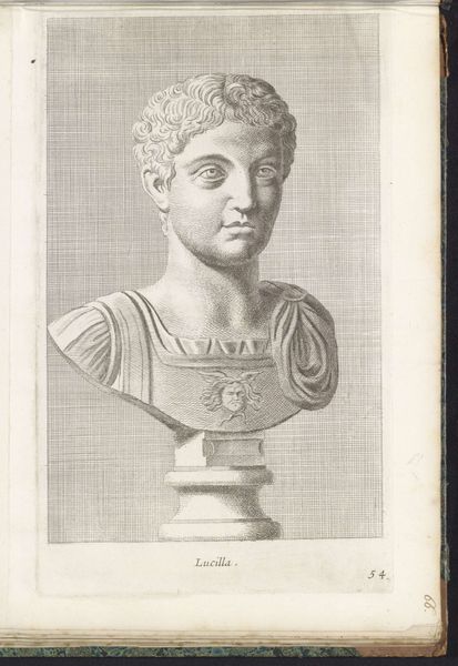 Here, we see "Buste van een jongen, naar rechts" (Bust of a Boy, Facing Right) created by Hubert Quellinus. It presents a study in form through the precise medium of engraving. The composition is strikingly simple: a young boy's bust is depicted with careful attention to the classical draping of the toga. Quellinus's technical skill is evident in the fine lines that define the boy's features and the subtle gradations of light and shadow. The formal restraint evokes classical sculpture, with the figure placed on a plinth, enhancing its timeless quality. This classical illusion asks us to consider how Quellinus uses line and form to mediate between historical ideals and immediate visual experience. The background is a grid, which destabilizes any fixed or singular reading by reminding us of its constructed nature and invites ongoing interpretations.