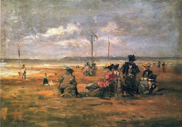 Editor: This is Eugène Boudin’s *Crinolines on the Beach*, painted in 1863. I'm struck by the muted tones; it feels both elegant and melancholic. What do you see in this piece? Curator: For me, this painting speaks volumes about the constructed nature of leisure and societal expectations, particularly for women in 19th-century France. These crinolines, while beautiful, also represent a kind of gilded cage. The beach wasn’t necessarily a place of liberation, but rather another stage upon which to perform bourgeois identity. Editor: That’s interesting, because I thought the beach offered an escape, a break from the rigid structures of city life. Curator: Well, consider the women themselves. Are they swimming or playing freely? No. They’re confined to their elaborate dresses, their movements restricted. Boudin is subtly critiquing the limitations imposed on women, even in spaces seemingly dedicated to leisure. What about the racial homogeneity in this picture? Editor: You’re right, there's a distinct lack of diversity. It makes you wonder about the unacknowledged labor and exclusion that enabled this scene of bourgeois relaxation. Curator: Precisely! And by noticing these details, we begin to understand the painting as more than just a pleasant beach scene. Boudin, perhaps unconsciously, documented a specific social reality defined by class, gender, and race. Editor: I'm starting to see the painting as less about a carefree day at the beach and more about the complex social dynamics at play. It really gives a new appreciation for the layers of meaning in what initially seemed like a simple landscape. Curator: Indeed, this artwork invites us to think about the unseen and unheard voices behind the scene and about historical constructs of seeing the world.