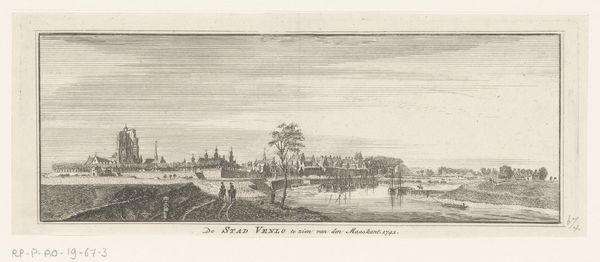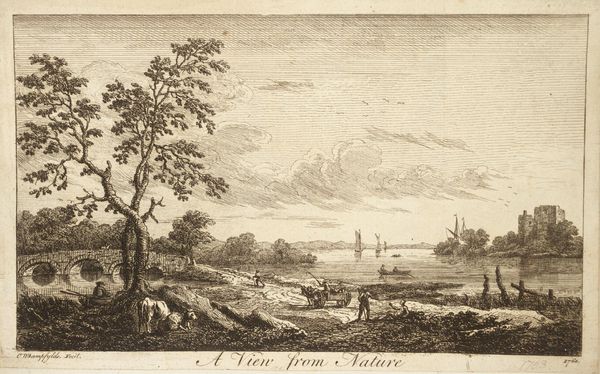 Curator: This etching by Reinier Nooms, entitled "The River Seine at the Bend of the Mall," dates to the mid-17th century. What are your first impressions? Editor: Serene. The composition feels so balanced, almost classically ordered. The light seems evenly distributed, giving the whole scene a calm, industrious mood. Curator: Precisely. The meticulous detail in Nooms' etching technique highlights the texture of the trees and buildings along the Seine, but it’s more than mere representation. The careful arrangement of forms directs the eye smoothly across the landscape. Consider how the placement of the boats echoes the curvature of the river. Editor: Yes, and if we look closer, it seems many of the figures are laborers. I wonder what their access was to representation in this period. I find it interesting to compare these detailed urban landscapes with those created for wealthier patrons—the contrast reveals so much about the negotiation of social realities. How does this etching speak to emerging Dutch nationalism? Curator: Interesting question! The artist meticulously describes everyday life while demonstrating mastery over perspective and light. It celebrates, visually, a precise balance between observation and artistry. It does this with formal control. Editor: Perhaps, but by focusing solely on aesthetics, aren’t we missing the story here? The growth of Dutch trade influenced artistic production, creating a demand for certain images reflecting and justifying specific activities of those in power. Even a seemingly neutral landscape perpetuates cultural norms that favored mercantile society and obscured those outside. Curator: Perhaps there is truth to your argument. In my view, that sociopolitical frame takes away from understanding how light, space, and form come together within the internal structure. Editor: Fair enough. It seems even an image with the most balanced composition contains inherent complexity, ready for an ongoing dialogue between history, technique, and cultural theory. Curator: Absolutely, let’s meet again.