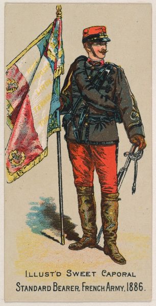 This small chromolithograph was made by the Kinney Brothers Tobacco Company in 1853 as part of a series to promote Sweet Caporal Cigarettes. It depicts a French Zouave soldier. The French army recruited Zouaves from Northern Africa, particularly Algeria. Their distinct uniforms, marked by baggy trousers, short open-fronted jackets, and oriental headwear, reflected this origin. During the 19th century, the French empire expanded into parts of Africa and Asia. Tobacco companies would often utilize images of soldiers from around the world to market their products. The idealized image flattens any sense of the realities of military life, and the experience of the colonized. Although small, this card presents a window into how identity, race, and nation were carefully manufactured and commodified in support of colonial ambitions. It invites us to reflect on the power of representation and the stories that are told and left untold.