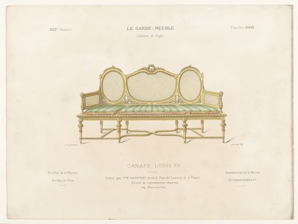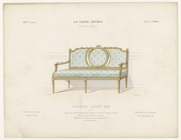 Editor: Here we have Léon Laroche's "Chaise Longue," dating somewhere between 1895 and 1935. The lithographic print itself feels quite delicate. It is hard to imagine that someone used this blueprint to create something quite real. What strikes you when you look at it? Curator: You're right, it does feel rather ethereal, doesn't it? Almost a dream of a chaise longue rather than a working drawing. For me, the interesting tension lies in that precision—those lines, meant to be translated into sturdy form—juxtaposed with the sheer whimsy of the Louis XV style. Imagine sinking into those curves! Editor: So, is it all about luxury and the escapism it represents? Curator: Perhaps. Or perhaps it's a longing for a different era, a different mode of living. I see hints of that in the Rococo-style flourishes, this kind of gilded cage, a gentle reminder that even beauty can sometimes confine us. Doesn’t the ghostly grey sort of reinforce that feeling? Editor: Yes! It's like a faded memory, a longing for a bygone era. I see the detail in the gilded embellishments, a sense of opulence and grandeur. Is the grey lithograph suggesting we can only see that from a distance now? Curator: Exactly! We're left to interpret this relic. This makes me think, does design reflect a certain state of mind of a society at any given point? Editor: Definitely gives you something to muse about as you rest upon this… well, the idea of it! Curator: Indeed, it is a space to relax. A print and the piece it wants to become both present options in different times, perhaps both impossible now! Editor: That's such a different way of seeing this objet d’art—thanks for helping me dive deeper!
