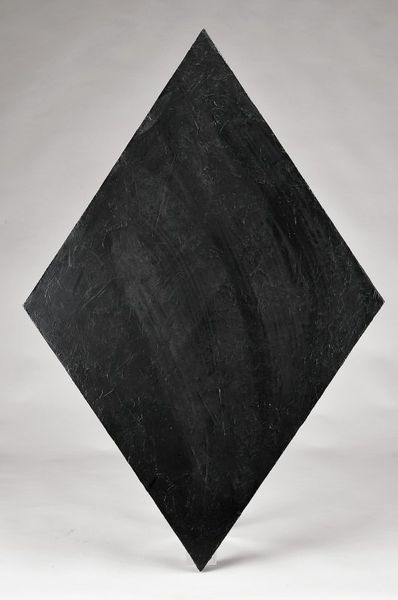 Editor: This object, from around 1830, is titled "Hat of black glossy paper over cardboard core with oilcloth lining." What immediately strikes me is the stark contrast between its intended formal appearance and the clear fragility of its materiality. How do you interpret this work, focusing on its formal aspects? Curator: Focusing on the internal structure of the piece, we see a fascinating tension between imitation and genuine form. The artist, J. Leenarts, meticulously replicates the silhouette of a formal top hat, typically associated with affluence and societal position. But by employing such ephemeral materials – paper, cardboard – Leenarts establishes a dichotomy. Is this a commentary on the performative nature of social status? Consider the texture; how does the gloss of the black paper, seemingly mimicking polished silk or beaver fur, interact with the underlying rough cardboard core? Editor: It’s interesting you point that out. So, if the gloss mimics the upper class, is its construction a structural facade? I'm struck by the somewhat precarious nature of the wide, flat brim. Curator: Precisely. Note how the artist utilizes form to generate meaning. The planar structure, mimicking textile, reveals the fundamental geometric volumes inherent to millinery of the time. We may see the contrast between intent and material reality, but this speaks to the construction of symbolic weight. How would you describe the effect of the slightly upturned edge of the brim on the overall impression of the piece? Editor: I think that slight upturn creates movement, defying the rigid shape of the hat, and almost satirizing a rigid figure of authority. It's almost a wink, a silent gesture undermining the initial formality. Curator: An astute observation. Through close observation and focused analytical questioning, we discern both the overt and covert communications embedded in the object's inherent structure and materials. It urges us to look deeper at material choices as not only signifiers but essential form in and of itself. Editor: I appreciate how examining these tensions reveal layers that I hadn't noticed. Curator: Indeed, the piece embodies what results when structural exploration confronts conventional expectations.