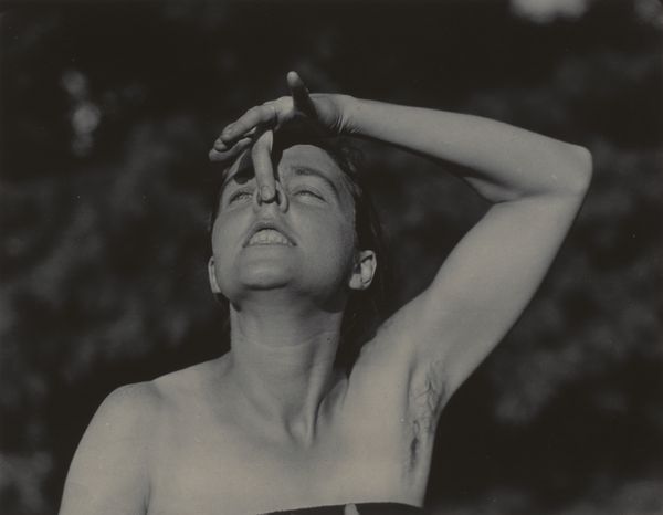 Curator: This gelatin-silver print, simply titled "Edith, Danville, Virginia," was created by Emmet Gowin sometime between 1963 and 1989. The photograph encapsulates a quiet moment. Editor: My first impression is of a pensive mood. The delicate shadows playing across her face evoke a feeling of both vulnerability and strength. It’s beautifully composed. Curator: Absolutely. Those shadows cast by what seems to be a branch, become almost symbolic. Is it a mask, a filter? How do you interpret them? Editor: They remind me of Daphne's transformation in Ovid. There's a sense of being intertwined with the natural world, almost becoming part of it. Gowin often photographed his family; this photo really speaks to the idea of woman as muse. The work fits within the wider social shifts and increasingly visibility of women in the late 20th century. Curator: Interesting parallel. The organic quality created with branches might echo the transformative quality that love, life, nature all pose to our being. It’s more than just a physical representation. Editor: Exactly. And consider the societal role of women within a familial setting in the mid to late 20th century. Often seen as secondary figures to their husband, brother or fathers. Placing Edith against a natural environment that gives her this intertwined, organic form seems intentional, powerful. It defies that previous marginalization. Curator: That reading makes so much sense. Her gaze isn’t directed at us either, but seemingly inward. The picture moves beyond surface, instead opening up introspective considerations about identity and natural presence. Editor: This quietness allows the viewer to project and connect. We find resonance across different timelines or societies and appreciate shared notions of intimacy, strength and feminine personhood. Curator: Yes, it makes you appreciate the depth and sensitivity contained within a simple black and white image. It's an ode to observation and patience. Editor: It highlights how powerful photographs of personal relationships are. And how powerfully those intimate family spaces mirror historical shifts and changing societal tides.
