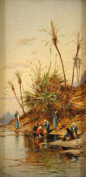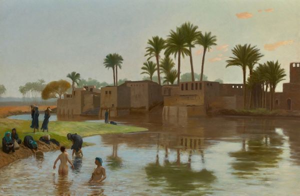 Editor: Here we have “An Arab Caravan,” an oil painting by Jean-Léon Gérôme. The detail is striking; you can almost feel the heat radiating off the sand. It feels so serene, yet there’s a clear narrative unfolding with all these figures and animals. What stands out to you in terms of composition and form? Curator: Note the acute attention to detail in the textures – the rough hides of the camels, the shimmering surface of the water. The strong horizontal lines create a structured, almost frieze-like effect, dividing the painting into distinct registers. Observe how the tonal range creates a subtle transition between light and shadow, modulating depth without overwhelming the scene. How do you think this balanced tonal structure informs the composition? Editor: I see how the balanced tones create visual harmony, but also a bit of a disconnect. The landscape seems timeless, while the caravan itself is very much of a specific place and time. Curator: Precisely. The painting eschews dramatic flourishes in favor of meticulous rendering. Consider the relationship between the objects and the setting – how the shapes relate within a calculated visual plane. The brushwork creates detail in a relatively shallow picture plane. What is the resulting impression? Editor: It's incredibly skillful but feels a little detached, like a perfectly staged tableau. I appreciate how it shows off Gérôme’s ability to render minute detail with light and shadow, it also shows how even realistic looking works can reflect the painter's intentions above lived reality. Curator: An excellent point. This underscores how every element—line, color, texture—contributes to the construction of meaning, irrespective of its historical context.