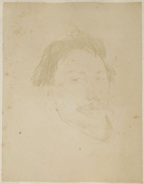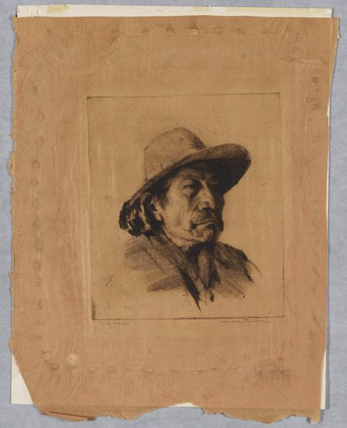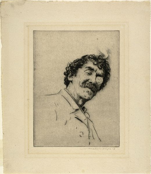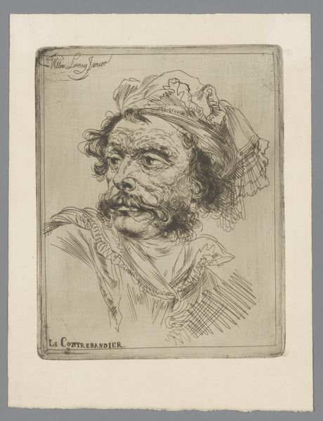 Editor: This is a print called "Portret van Frans Hals, naar een zelfportret," created between 1885 and 1909 by Mary Hector Rupert Cantineau. It’s an etching, and I’m struck by how much texture the artist was able to achieve using only line work. What formal elements stand out to you? Curator: The artist demonstrates a compelling manipulation of light and shadow. Observe the density of the etched lines in the darker regions of the coat and hair, juxtaposed with the comparatively sparse lines delineating the face. This creates a sense of depth and volume. Notice also the compositional balance, the artist contrasts the precise details on the face, with the suggestive sketchiness on the dress, making you wonder if this was on purpose? Editor: Yes, I hadn't noticed that—it's like the dress is unfinished, almost abstract. But, going back to the face: How does the mark-making there contribute to the portrait's impact? Curator: The meticulousness around the eyes and mouth invites closer inspection. The artist captures a particular expression through the interplay of lines, conveying, perhaps, a sense of introspection or even melancholy. The cross-hatching is carefully placed to sculpt the features, adhering to established artistic conventions for rendering the human form, giving the character weight. Do you find these visual elements support a particular interpretation? Editor: I see what you mean, the careful line work creates a focused, weighty image. The interplay between detail and suggestive abstraction is so unique. I didn't notice that until now. Curator: Indeed. Formal analysis reveals that Cantineau’s expertise is quite unique in translating painting into line.