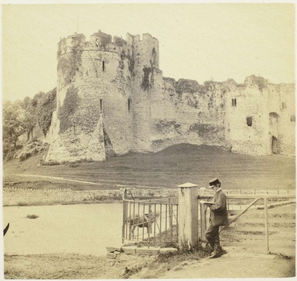 Editor: So, this is Keith Arnatt's "A.O.N.B. (Area of Outstanding Natural Beauty)" from around the 1970s. It's a black and white photograph of a ruined castle overlooking a river. It feels quite bleak and ironic given the title. What's your take on Arnatt's perspective here? Curator: The irony is precisely the point. Arnatt critiques the romantic ideal of the 'picturesque' often associated with these designated areas. He's interrogating how we frame and consume "natural beauty" through a lens of class, power, and societal expectation. The photograph asks us, who benefits from this constructed vision of beauty and who is excluded? Editor: That's fascinating. It makes me see the barrier in the foreground differently, as a literal and metaphorical boundary. Curator: Exactly. Consider also the history embedded in that ruin and the labor that built it. The image invites us to unpack these layers and question whose stories are being told, and whose are erased, within this seemingly idyllic landscape. Editor: I never would have considered all of that from just looking at it. I appreciate the depth of analysis. Curator: And I'm encouraged by your insights into the material conditions of the landscape, as an important element in interpreting the politics of the image.