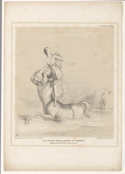 This lithograph entitled 'Omnibus getrokken door kamelen en een officier en postbode' was made by Cham, the pseudonym for Amédée de Noé. Cham produced this piece during a period of French colonial expansion, specifically their presence in Algeria. Cham's cartoon provides a window into the French perception of Algerian culture during this time. By depicting an omnibus pulled by camels, he creates a humorous contrast between the modern, urban mode of transport and the exoticized setting of Algeria. This juxtaposition reveals a colonial gaze, one that seeks to assimilate and integrate the foreign landscape into a familiar framework. The caricatured figures of the Algerian people, rendered with exaggerated features, underscore the power dynamics at play. We might ask ourselves how Cham’s rendering exoticizes a culture different from his own, and whether the work reinforces or challenges prevailing stereotypes of the time. The humor underscores a cultural divide, inviting viewers to reflect on the complexities of cross-cultural encounters, and the lasting impact of colonial narratives on identity and representation.