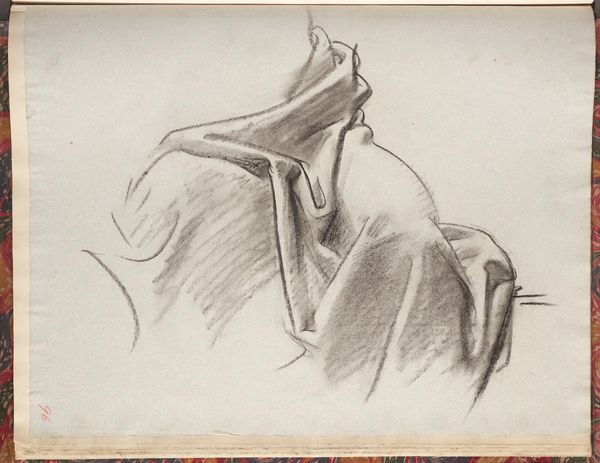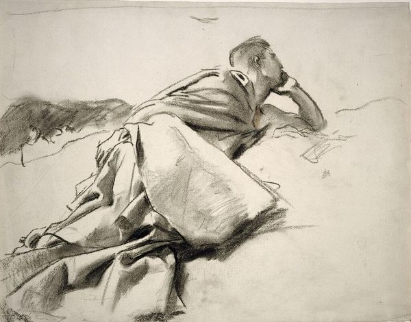 Curator: This somber preparatory drawing by John Singer Sargent is titled "Study for the Prophet Obadiah, Boston Public Library." Editor: Immediately, I'm struck by the figure's posture, that hand obscuring the face-- a universal signifier of anguish or deep contemplation. The draping fabric almost cocoons him. Curator: Sargent used charcoal on paper for this study. It reveals his process—the raw materiality of the charcoal allows us to see the build-up of tones and the artist's hand at work. Editor: Yes, and thinking about Obadiah, he was tasked with prophesying doom and destruction. The weight of that responsibility, the isolation of his position... it feels palpable here. Considering Sargent’s other commissions, portraying wealth and privilege, this feels like a departure that speaks volumes. Curator: I agree. It's a window into the labor involved in creating the murals for the Boston Public Library, a testament to his dedication. Editor: It reminds us that even artists celebrated for their depictions of beauty and opulence can grapple with profound human themes, giving voice to the marginalized and burdened. Curator: A powerful reminder. Editor: Absolutely.