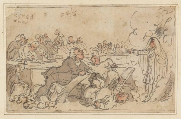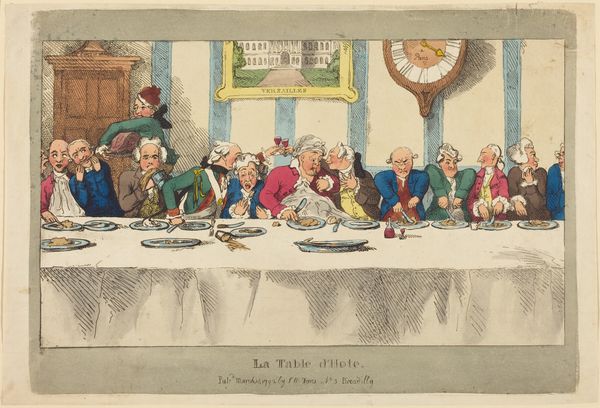 Editor: So, this is "A Two O'Clock Ordinary" by Thomas Rowlandson. It seems to capture a chaotic dining scene. What really strikes me is how everyone seems to be scrambling for food. What can you tell me about this print? Curator: Look at the rapid, etched lines. It shows Rowlandson's process of production – a quick, reproducible image aimed at a broad consumer base. The text above, about scarcity and contentment, highlights social inequalities inherent in consumption habits. What does it say about class, labor, and access to resources, do you think? Editor: It sounds like Rowlandson is commenting on the societal scramble for resources, and how that plays out even in something as ordinary as a shared meal. I never would have considered how the *process* of making the artwork also reflects on this. Curator: Exactly! The materials, the method of reproduction, and the subject matter all speak to the economic realities of the time. I'm glad we could both learn something.