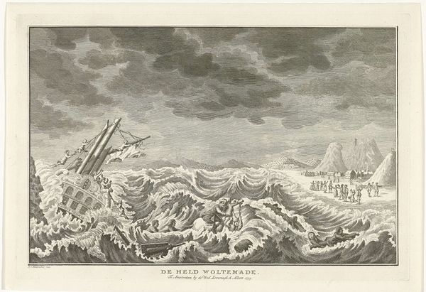 Curator: We're looking at "L'Eau," or "Water," part of the series "The Elements" by Reinier Nooms, created sometime between 1635 and 1670. This etching captures a tempestuous seascape. Editor: My immediate reaction is one of awe and a little bit of anxiety. The stark monochromatic rendering really emphasizes the dynamism of the scene—you can almost feel the ocean's raw power. Curator: Absolutely. Consider that Nooms, also known as Zeeman, was a sailor himself. This lived experience gives the piece a visceral authenticity. What do you see regarding class and the relationship between humans and nature? Editor: There’s a clear tension there. On the left, figures on what looks like a coastline are being battered by wind and the waves; to the right is a vessel seemingly capsizing, all engulfed by a chaotic scene that seems to imply our helplessness against natural elements. Do you think the lack of detail works in its favor? Curator: I do, because it pushes the symbolic potential of water from purely environmental to emotional and psychological; Nooms places water as a dominating force, disrupting commercial activity, destabilizing human endeavors. His use of etching captures that, conveying light as almost struggling to cut through, mirroring societal power structures challenged by unpredictable forces like the sea, and in turn perhaps political upheaval, inequality, and class disparity. Editor: Yes! And it's fascinating how the artist uses only subtle changes in line density to depict the varying textures of the sea, the clouds, and the ships. In some sections, it creates incredible depth; other parts are flattened, highlighting pattern and design. Curator: It truly is a testament to Nooms' ability to extract social resonance from the formal elements, transforming a scene into a narrative of both human struggle and resistance. Editor: I'm leaving with a stronger sense of water as an actor, both a site of potential destruction but also one of journey, of refuge. Curator: Yes, it reveals Nooms' contribution to discussions of social and political order, reminding us that the elements demand both respect and accountability.