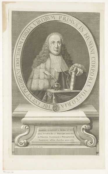 Editor: We're looking at a print, "Portret van Filips V, koning van Spanje," or "Portrait of Philip V, King of Spain," created sometime between 1722 and 1775 by Georg Friedrich Schmidt, currently held at the Rijksmuseum. It feels very stately, but in a sort of… stiff way? What stands out to you the most in this engraving? Curator: Oh, isn’t it just magnificent in its own stoic way! For me, the oval frame is practically screaming Baroque drama, even within the formal setting of royal portraiture. Then you’ve got Phillip in his full armor. But there’s something in his gaze, perhaps…weariness? Almost as if the weight of the crown sits heavy on his powdered wig. Does that resonate with you at all? Editor: I see what you mean, especially the contrast between the heavy armor and his, sort of soft face. What do you make of the landscape behind him? It's so subtly done, it almost fades into the background. Curator: Indeed! It's interesting how the artist contrasts the delicate, almost ethereal landscape behind Philip with the king's very solid, very *present* armor. One foot in the natural world perhaps? The other in courtly responsibilities. And that hand offering flowers. Such an intriguing addition. I keep imagining his feelings, was he weary or perhaps merely longing to garden? I always love picturing their daily lives! What story do you think the artist wanted to convey, beyond just a king in armour? Editor: I guess the artist was perhaps interested in representing the duality of power. You know, strength versus maybe a longing for peace and simpler things? I didn’t quite read that at first. Curator: Exactly! And aren’t those the most satisfying artworks, the ones that gently nudge our understanding of history and human nature? It's why I keep coming back to these portraits. They whisper their secrets. Editor: I totally agree. I see so much more than just a royal portrait now, thanks!