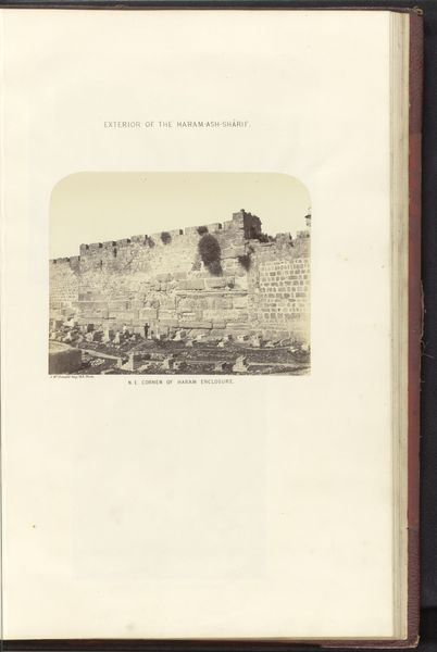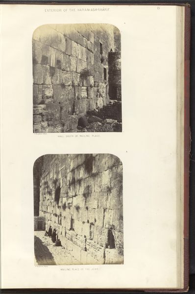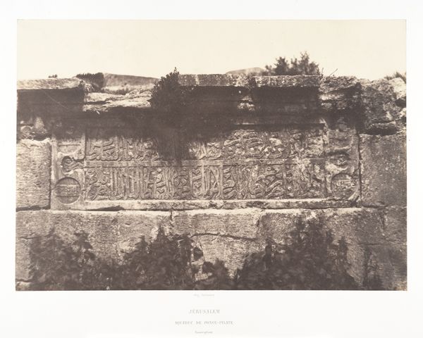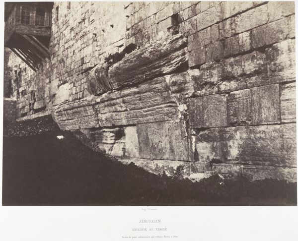 Auguste Salzmann created this photograph, Jérusalem, Enceinte du Temple, Face Est de l'angle Nord-Est, using a paper negative. Notice how Salzmann's composition focuses on the monumental stone wall, filling the frame and creating a sense of imposing presence. The contrasting textures, from the roughly hewn stones to the smoother, more uniform blocks, offer a rich visual experience. Salzmann’s choice to capture this subject through photography invites us to consider the documentary potential of the medium. The meticulous detail and tonal range reveal not just the physical structure, but also the effects of time and environment on the ancient stones. This interest in capturing reality intersects with broader philosophical concerns about the nature of truth and representation. Consider how Salzmann's image functions within the context of 19th-century debates about history, religion, and the role of photography in documenting and interpreting the world. The formal qualities of the photograph, its composition, and texture, contribute to its power as a historical document and as a work of art.