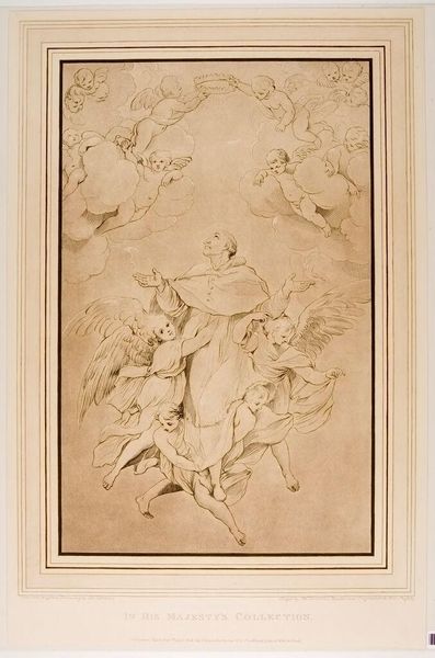 Curator: Antoine Rivalz's "Coronation of the Virgin" captures a heavenly scene in delicate brown ink and wash. I’m immediately struck by the swirling movement and the dramatic chiaroscuro. Editor: The upward surge definitely gives a sense of divine ascension. It’s a typical scene of baroque iconography. The composition draws on centuries of theological symbolism, from the Holy Spirit as the dove to the instruments of Passion flanking the Virgin. Curator: The virgin Mary is at the center, hands pressed in prayer. Angels guide her towards God the Father and Christ, who hold a crown above her head. Note how Rivalz uses light to emphasize her purity and grace as she ascends to her rightful place. Editor: It’s interesting how Rivalz translates established religious iconography into a distinctly 17th-century visual language, especially given the socio-political dynamics of art patronage at the time. One wonders about its reception in the context of religious and royal power structures. Curator: It’s a work deeply rooted in tradition, but also very much of its time. Editor: Indeed, and considering its formal qualities alongside its socio-historical context, it gives us much to think about.