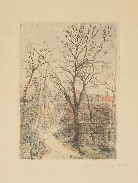 Abraham Rutgers created this ink drawing, "View along the City Wall of Utrecht," likely in the latter half of the 17th century. Its sepia tones and delicate lines offer a tranquil, almost dreamlike vision. Notice how Rutgers uses linear perspective to guide our eye along the path, from the dark foreground toward the distant Mariakerk. The rhythmic repetition of trees along the right creates a visual cadence, juxtaposed against the stark, geometric facade of the building on the left. The artist has masterfully used shadow to create depth, especially evident in the contrast between the sunlit path and the shaded side of the building. Rutgers uses a limited palette and precise lines to create a scene that feels both realistic and carefully constructed. The drawing invites us to consider how urban and natural landscapes intersect, and how perspective can shape our perception of space. The drawing emphasizes an era increasingly interested in scientific observation and the formal study of space.