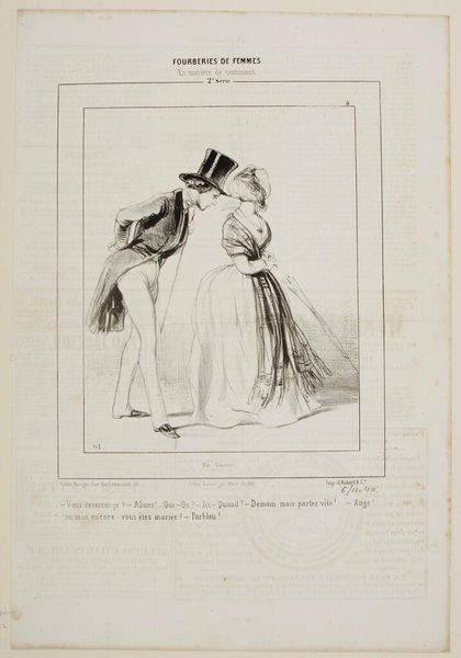 Editor: This is a print by Paul Gavarni, called "Enough! When will you give me a little affection for tonight? - How Trite!" It seems to depict a moment of strained interaction between a man and a woman. What historical insights can you share about this piece? Curator: Gavarni was known for his satirical takes on Parisian life. This image, with its theatrical figures and pointed caption, critiques the performance of courtship and perhaps the commodification of affection within the social rituals of the time. It reflects the emerging social dynamics of 19th-century urban life, doesn't it? Editor: It does. Seeing it in that light, it almost feels like a commentary on social expectations and gender roles. Curator: Exactly. Gavarni used his art to hold a mirror to society, prompting viewers to question the values and behaviors they often took for granted. Editor: I hadn't considered that before. Thanks! Curator: My pleasure!