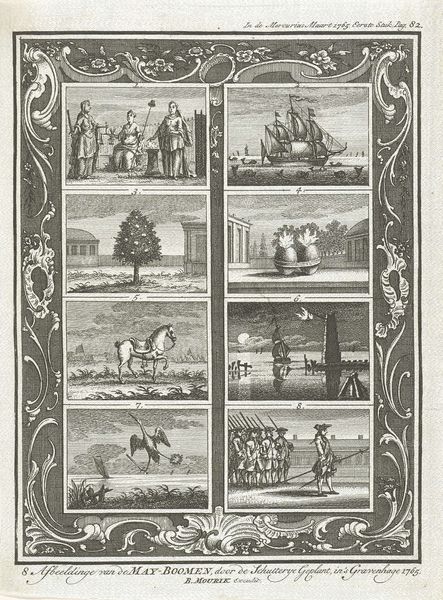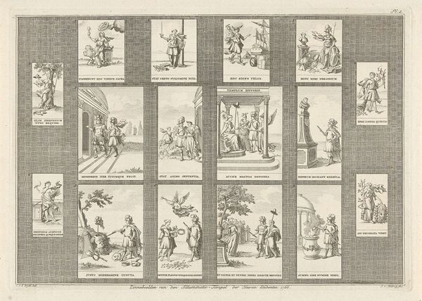 Editor: Here we have "Hollandse vermaken in de twaalf maanden, ca. 1750" – a print by Jan Caspar Philips at the Rijksmuseum. It’s an engraving, and it almost looks like a calendar, with these little vignettes. They seem to capture daily life... a bit like visual proverbs. What strikes you when you look at this piece? Curator: Oh, this piece is a real charmer! It whisks me away to a bustling 18th-century Holland. See how each little scene hums with its own story? I like to imagine myself right there with them – dodging skaters on thin ice, or haggling over produce in the marketplace. But it is the artist, who so masterfully compresses entire worlds into such tiny frames, I feel deeply for. What do you notice about the way Philips uses light and shadow? Editor: Well, the contrast is quite striking for a print. It almost creates a dramatic effect, given how everyday the scenes are. It's like he’s elevating the mundane. Is that typical for this period? Curator: Precisely! That dramatic touch is pure Dutch Golden Age – they knew how to find poetry in a humble bowl of fruit, or a rowdy game of kolf. And this "elevation" you mention – yes, artists saw it as their noble duty to celebrate the dignity and beauty of everyday Dutch life. Now, doesn’t it make you want to time-travel and experience it all first-hand? Editor: Definitely! It’s funny how such a small print can evoke such a vivid sense of time and place. I didn't expect to feel so drawn into the daily lives of people from so long ago. Curator: Indeed. Art allows us to eavesdrop on history. Next time, let's imagine the soundscape these images bring to our inner ear: frozen lakes squeaking, hawkers calling...oh, my, time traveling is a wonderful journey in itself!
