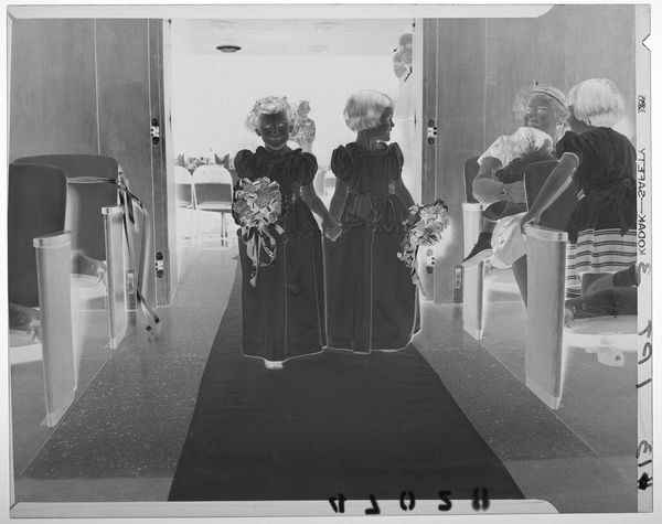 Curator: This intriguing photograph, simply titled "Untitled," comes to us from the lens of Martin Schweig. Editor: The high contrast and crisp lines lend it a poised yet unsettling quality, almost dreamlike. Curator: The image, roughly 4 by 5 inches, portrays two young women with bouquets at the foot of an ornate staircase, likely taken in a domestic space. I'm curious about what their role might be in this staged scene. Editor: Indeed. The symmetry of their dresses and bouquets, coupled with the formality of the setting, suggests a staged ritual or ceremony, perhaps debutantes. The staircase, a repeated motif in art history, could symbolize aspiration or a transition. Curator: I agree. The material circumstances surrounding debutante balls are always interesting to consider. This picture could serve as a reminder of the economic pressures underlying these social rituals. Editor: A powerful tension is at play between surface elegance and underlying social structures. Curator: It leaves one with much to think about. Editor: Absolutely.
