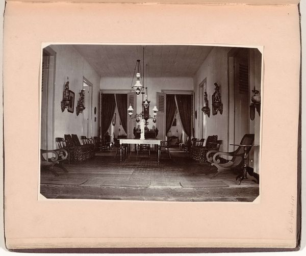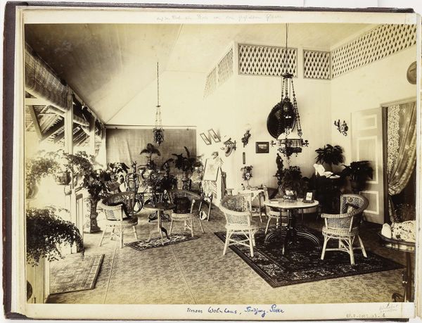Editor: This gelatin-silver print, "De versierde societeit," or "The Decorated Society," was captured in 1922 by an anonymous photographer. It looks to me like a photograph of a hall that is filled with tropical vegetation for a party of some sort. What details jump out at you? Curator: Well, considering this photograph is a gelatin-silver print, a process becoming increasingly common at the time, it suggests a wider accessibility to photography as both art and documentation. The very act of 'decorating' a space – think about the labour, the specific materials chosen, likely mimicking exotic locales - and then recording it becomes a fascinating social commentary, no? It hints at a desire to consume and display wealth through fleeting experiences and readily available processes of photographic image-making. Editor: So you’re seeing the decoration itself and its photograph as almost an early form of consumerism? The vegetation, though real, is staged? Curator: Precisely! This is not just documentation, it's also about what it meant to procure and showcase these materials. Consider where the plants came from, the social implication of holding such parties, the act of photographic representation and documentation in terms of access and consumption... And this party scene is further immortalised through the reproducible medium of gelatin silver. Does that perspective reshape your first impression? Editor: It really does. I initially saw just a festive scene. Now I am questioning the societal mechanisms behind this seemingly candid image. I wonder who that space was 'decorated' for! Curator: Exactly! It highlights the fascinating ways materiality intersects with social performance. A photograph like this one invites us to ponder these complex exchanges.
