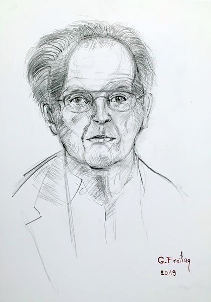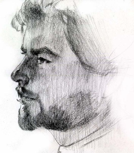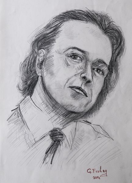 Gazmend Freitag created this drawing of Bekim Fehmiu using graphite on paper. The portrait dominates the composition. The light and shadow, built up with the varying density of graphite, define the planes of Fehmiu's face, creating a three-dimensional form on a two-dimensional surface. The diagonal lines, particularly in the hair and suit, inject a sense of dynamism and movement, contrasting with the static nature of the portrait. This interplay between static and dynamic elements creates a visual tension, drawing the viewer's eye across the artwork. The gaze of the subject directed to the left adds a narrative element. The subject’s gaze implies a connection beyond the frame, suggesting a broader context. Freitag uses the formal qualities of line, shadow, and composition not just to represent Fehmiu, but to invite reflection on the relationship between the subject and the space he occupies, both within and beyond the picture.