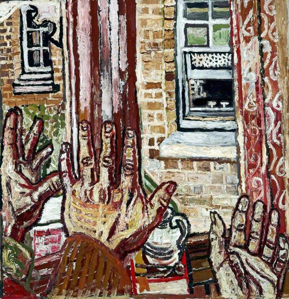 Editor: So, this is John Bratby’s “Jean and Still Life in front of a Window,” painted in 1954. The clashing patterns and raw brushstrokes give it this almost overwhelming, visceral feel. What do you make of the sheer accumulation of objects and the way they’re presented? Curator: The still life overwhelms, yes, but notice the iconography of the everyday. This is post-war Britain, austerity still fresh in memory. What stories do these brand names, these familiar kitchen items, tell us about the domestic sphere and the rising consumerism of the time? Editor: I guess I hadn’t considered it that way. The cereal boxes now feel less like clutter and more like…evidence? Almost archaeological. Curator: Precisely! Look at the prominence given to sugar. Consider what it symbolized then – luxury, sweetness, but also dependence. And the exposed figure of Jean, seemingly vulnerable amidst this accumulation. What connections can you draw? Editor: So, maybe the figure represents the individual within this increasingly object-filled world? Perhaps questioning whether we control these objects or they control us. Curator: An astute observation. Bratby was associated with the Kitchen Sink painters. This wasn't simply about painting the mundane, but about investing it with psychological weight, revealing the unspoken narratives of ordinary lives. The kitchen becomes a stage. Editor: I hadn't realized how much symbolism could be packed into something that seemed like just an everyday scene. It’s definitely shifted how I see his painting. Curator: Indeed. The power of the image resides not only in its surface, but also in the echoes of cultural memory and the silent language of objects. A potent reminder that even the most unassuming tableau speaks volumes if we learn to listen.