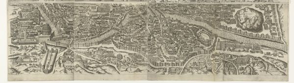Curator: Looking at this print, "Map of Rome. Lower left part" created in 1634 by Matthäus Greuter, my first thought is just, wow, such an incredible amount of detail. It feels so rich and somehow still… playful. What’s grabbing your attention, Editor? Editor: It’s a beautiful object. Seeing the work that went into engraving those minute lines… thinking of the production of prints like these in the 17th century, how they circulated, who had access to them— that's where I see the true value. It speaks volumes about early modern urban life and information dissemination. Curator: Right. You zero in on the material history! And of course, beyond just dissemination of knowledge, the map is designed with the baroque aesthetic in mind. There's a lot going on with the symbolism around water and aqueducts down in that corner— the Tiber river god, Romulus and Remus, those figures with the pouring vases... It isn’t just functional; it’s trying to be visually and intellectually impressive, right? Editor: Absolutely. The inclusion of these symbolic elements— the city's water sources personified, ancient mythology juxtaposed with the city's present state – is meant to assert Rome's authority. The artist strategically interweaves production capabilities and the symbolic capital into its very representation. Consider also the paper it's printed on – was it locally sourced? What's the supply chain for its creation look like? Curator: Hmmm, very intriguing. I never really focused on the paper before, too lost in the cityscapes themselves, how much work went into rendering the tiny streets and structures. But those flourishes and those personified Roman icons serve a vital purpose – reinforcing the eternal idea of Rome. I am completely fascinated with how the physical reality and ideological meaning can occupy the same frame. Editor: And, to circle back, it’s important to recognize the hands that made this. Whose labor printed this? Who transported the prints and where? Art is, in fact, work. Considering its economic and social contexts is paramount to understanding its enduring appeal. Curator: Very true. I appreciate that shift in perspective so much, shedding light not only on how it looks, but also on what kind of value these maps had, the kind of power. Editor: Exactly. With a fresh look, the next visitor will also see beyond what initially seems like just an exquisitely detailed map.