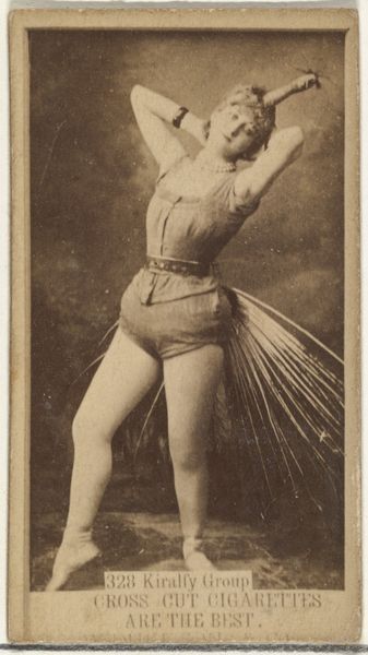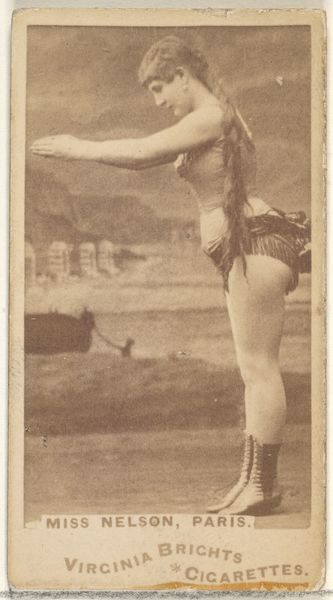 Curator: This is a piece titled "Adele, from the Actors and Actresses series (N45, Type 1) for Virginia Brights Cigarettes" created sometime between 1885 and 1891. It’s part of a larger set of trade cards distributed by Allen & Ginter, combining photography and printmaking. What catches your eye? Editor: Whoa. That's...striking. Right away I see power. She's got this gaze that says "Don't mess," and those biceps... impressive. It’s unexpected, almost like a challenge to the viewer, or maybe even the whole concept of demure femininity at the time. Curator: Absolutely. These cards, popular in the late 19th century, served as advertising, but they also inadvertently became documents of social change. Presenting actresses and performers, they offered a public stage for women in ways previously limited. Editor: It's the details for me; she is controlling a little whip or crop and the fact that the cards were literally distributed *in* cigarette packs, that’s really bizarre but adds to the picture. She has real authority in her eyes. It’s sort of subversive. Were these like... pin-ups, but make it... progressive? Curator: In a sense, yes. The mass production and distribution meant these images circulated widely, influencing public perceptions. It created a visibility for these women and opened up discussions, however limited, about their roles and aspirations beyond the domestic sphere. The Virginia Brights company may have been focused on commerce, but they became implicated in wider cultural currents. Editor: And it makes you wonder about Adele herself. Was she in on the image, or just doing her job? There’s such agency radiating out. For what was likely mass-produced stuff, you sense someone singular in there, even now. Curator: I agree. The layers of representation, the tension between promotion and self-expression… they offer a snapshot into a rapidly changing world. A potent little picture. Editor: Definitely gives you something to chew on – maybe instead of smoking 'em! A fierce image, indeed, still whispering defiance from a bygone era.