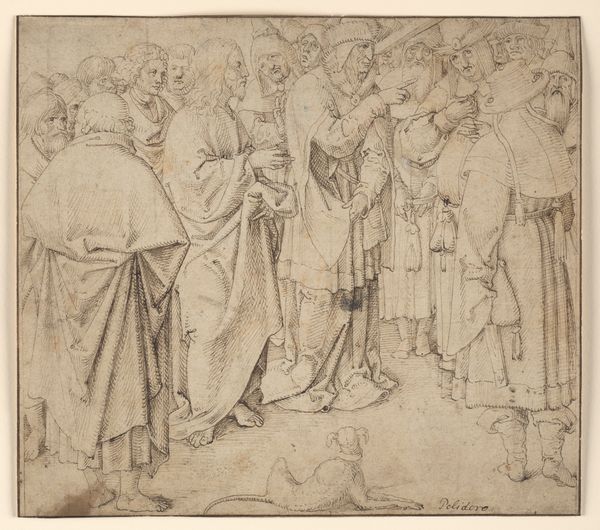 Editor: Here we have J.L. Lund's pencil drawing, "Knud den Store ved strandbredden," dating from between 1825 and 1830. The scene has a stillness about it, even with the King dramatically pointing toward the sea. It feels like a staged history painting. How does the history surrounding this drawing inform our understanding of it? Curator: The historical context is crucial. Lund created this during a period of intense national romanticism in Denmark. Artists sought to establish a unique Danish identity, often by looking back to idealized versions of their history. The story of King Canute, or Knud, commanding the tide to stop, was a popular symbol of both royal power and its limits, used to instill specific notions of power. Editor: So, Lund isn't just depicting a historical event; he's engaging in a conversation about leadership and national identity? Curator: Exactly! The very act of choosing this narrative and presenting it in this manner–emphasizing the King's authority and connection to the land–contributes to constructing a national narrative. It's worth asking ourselves how this image might have functioned politically within the Danish art world and broader public sphere. The selection of such moments can be interpreted as part of a political and cultural program that aimed to unify the populace around a shared past. Editor: That's fascinating! It's not just about illustrating history but using it to shape contemporary society. I didn't quite get it at first, I just saw an illustration. Curator: And how does the landscape affect our reading of this? Note that Lund strategically places the king on the beach - not in the battlefield or a hall of power. The beach is between civilization and raw nature and it puts King Knud in relation to both domains. Editor: Right, I'm looking more carefully now! This has been really insightful; thanks for sharing this perspective! Curator: My pleasure! It's a good reminder that historical art is never just about the past; it's a dialogue with the present.