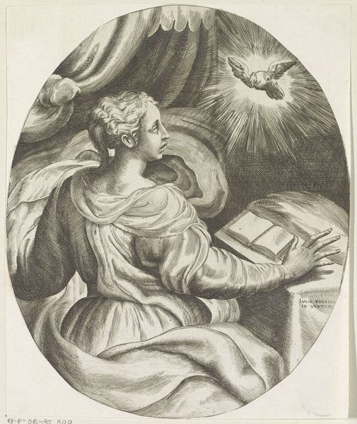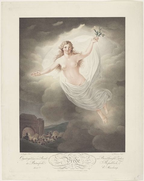 Editor: This engraving from around 1795 by Lambertus Antonius Claessens is titled "Verlichting." The figure, reclining on a cloud with what looks like a globe below, gives me a sense of floating above earthly concerns. What historical perspectives inform your interpretation of this piece? Curator: This image encapsulates the Enlightenment ideals spreading across Europe at the time. "Verlichting" translates to "Enlightenment" in Dutch, suggesting it's an allegory. Consider how prints like these functioned as accessible forms of political and social commentary. Editor: So, it’s less about simple aesthetic beauty and more about conveying a message? Curator: Precisely! The nude figure is a classical trope, referencing ideals of reason and knowledge associated with antiquity. Note how the light emanating from her touches the globe, specifically illuminating "Europe." How does that emphasis strike you? Editor: It suggests that Europe is at the forefront of this enlightenment, maybe even implying a sense of European intellectual superiority. Almost…propagandistic, perhaps? Curator: Indeed. These images actively shaped public perception and legitimized certain political projects. It invites a deeper look at the role of art in constructing and disseminating power structures. How does considering the print's wider circulation influence your appreciation? Editor: It makes me rethink the image's intention, shifting from just appreciating its classical style to critically examining its underlying messages and potential biases within the context of European dominance. I see now that it's more complex than initially appears. Curator: Exactly. By understanding its historical context and the social role this print served, we can better decode its visual rhetoric. It really highlights the power of imagery!