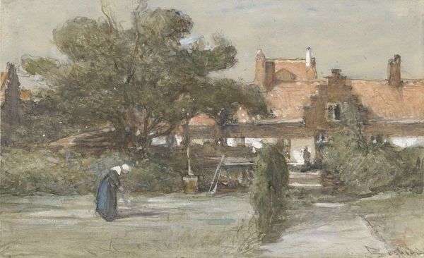 Editor: We’re looking at John Constable’s “Flatford Mill,” painted around 1810-1811, using oil paints. There's a certain warmth in the light, but also a structural rigidity with the defined building edges, and I wonder what you see when you look at this piece? Curator: I notice primarily how the artist uses color to create a sense of depth. The arrangement of these painted elements – building, water, and foliage – constructs the visual space. How do you view the painterly technique in this work? Editor: The brushstrokes feel quite visible, almost like the scene is actively being formed. It's less about perfect realism and more about capturing a feeling. Does that imprecision factor into how we read the buildings in contrast to the land? Curator: Precisely. The painting resists photographic accuracy, engaging, instead, with its own materiality. Note, too, how the application of pigment redirects your eye – light reflecting off a surface then contrasting against an unlit section; can you detect a conscious interplay there? Editor: Yes, it makes it very active. Almost like a living version of stillness... This focus on the components allows for a reading about their relation as much as about the place, itself. Curator: Precisely! A study of its formal properties – brushstroke, light, color, line – reveal both artist intention, and clues towards its aesthetic effect. Editor: It’s amazing how dissecting the components has opened a new way to consider it! Curator: Indeed, and by examining those properties it opens this painterly rendering into much more than the thing it’s representing.