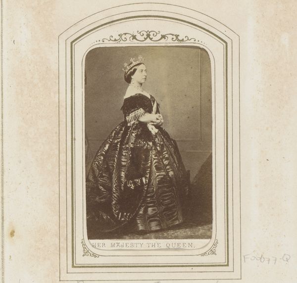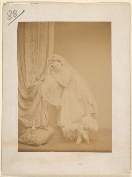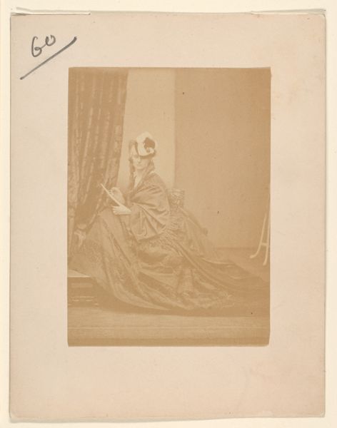 Curator: Looking at this, I can’t help but imagine I'm stepping back into a lavish drawing-room, the air thick with perfume. Editor: That's certainly the impression it gives. This is a portrait of Costigliole by Pierre-Louis Pierson, dating from the 1860s, part of our photography collection. And your immediate take is...luxury? Curator: Oh, undeniably. The ruffles! The pose, so deliberately nonchalant... But there’s also a melancholy air. She looks almost trapped, or perhaps just…bored? Is it the angle of her gaze? Editor: Interesting observation, especially within the context of Second Empire Paris. Photography studios became highly commercialized. It was a way for the rising bourgeoisie and aristocracy to visually affirm their status and emulate fashionable trends and even royalty, given Pierson’s close association with the court. Curator: I see it now, like a stage play... Every prop carefully arranged. Yet that hint of melancholy almost feels subversive. Was she making a commentary or am I overthinking it? Editor: These photographic portraits, while seemingly straightforward, offer a complex intersection of private and public identities, the performance of self under societal expectations. Consider the circulation of these images, accessible as keepsakes, cartes de visite. Status isn't merely displayed; it’s made portable, democratized, in a sense. Curator: It is an oddity. You know, in its subtle shadows, it actually reminds me of some paintings from that time! All the tiny folds of fabric. Editor: The connection to painting is not accidental. Pictorialism, which heavily influenced photographers of the time, sought to elevate photography as an art form on par with painting, so we do see a deliberate manipulation of light and tonality that simulates painterly effects. Curator: A clever, sneaky ambition. I appreciate that duality here, how the constraints become part of its artistic expression. Editor: The constraints are indeed where the creativity flourishes! Well, thinking about Costigliole's subtle revolt, and how identity gets framed within very specific social needs really makes you question the role of a museum's authority to collect such stories, eh? Curator: Yes! Each era sees itself differently reflected in its own mirrors. A truly complex conversation emerges between past and present. Thank you.