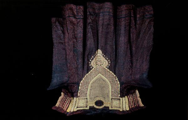 Curator: Here we have a Ritual Crown, also called a diadem, dating back to around the 18th century. The medium is listed as mixed-media, including gold, and it’s categorized as Asian art. Editor: It strikes me as imposing, even in a still image. The ornate golden details against the darker backdrop suggest considerable ritual significance. How would something like this have been manufactured? Curator: Well, goldwork requires specialized skills, particularly the openwork seen here. We're likely looking at a highly skilled artisan or team who would've used techniques passed down through generations, possibly within a workshop or guild setting. Consider also the effort put into sourcing these precious materials like gold, what socioeconomic implications did it bring? Editor: My eyes keep going to the central panel and then flitting between all five, each displaying different imagery within what appears to be a structured hierarchy. Would these have been deities or perhaps revered ancestors depicted? The craftsmanship lends each image an elevated quality. Curator: Likely deities, yes. And note how the visual program—the consistent presentation of figures across each panel— reinforces this religious doctrine. There’s definitely an intended cultural narrative at play here, a conscious deployment of imagery to solidify spiritual concepts and values within the society that used this object. What impact it could have had on the wearer. Editor: It really underscores how visual symbols carry such weight across time and culture, doesn't it? The way those figures are rendered evokes a feeling of otherworldly authority. What sort of impact on a community to view their leader, likely, wearing something that holds significant cultural history, that took immense material, gold, and a lot of effort, as we explored earlier. Curator: Indeed. I think it's objects like this, these “mixed-media” items, which allow us to think more complexly, more holistically, about these things in the world. That it goes further beyond a crown used for a status or role. Editor: It really reframes how we consider history when focusing on such culturally relevant items.