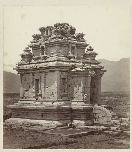 Here is a general view of Candi Parikesit, taken by Isidore Kinsbergen in the 9th century in Central Java province. The photograph, rendered in muted sepia tones, captures the temple's robust form, its materiality evident in the rough-hewn stones. The temple's structural integrity is immediately apparent, a testament to the sophisticated engineering of the time, though weathered and timeworn. The temple's architecture destabilizes traditional notions of the sacred by integrating elements of local animism with established religious motifs. Kinsbergen's composition encourages us to consider the temple within its broader geographical and cultural context. By focusing on the temple's physical presence and the interplay of light and shadow, Kinsbergen highlights not only its aesthetic qualities but also its function as a signifier of cultural values. This interplay challenges fixed meanings and allows for new perspectives on space, perception, and representation.