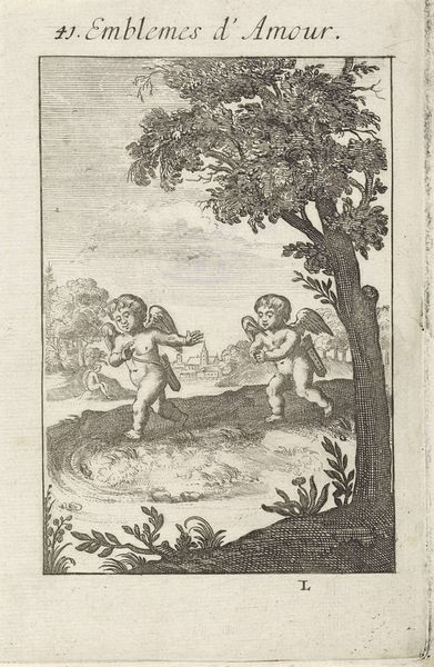 Curator: Welcome. Before us is an engraving from 1686 titled "Stoeiende putti in een landschap," which translates to "Fighting Putti in a Landscape". Jan van Vianen is credited as the artist, and it's now part of the Rijksmuseum's collection. Editor: My immediate impression is… pure, almost frantic joy. It feels incredibly active. These little cherubs are positively tumbling over each other! Curator: Indeed. This engraving captures a seemingly innocent scene, but within the context of late 17th-century Dutch art, there is likely an intent beyond simple playfulness. These images circulated as illustrations to books of emblems popular in the Baroque. They were not so different from our cartoons but intended for an educated audience to unpack in terms of a social lesson. Editor: The emblems certainly provide more context, it shifts the meaning beyond playful children in a grove. I am immediately drawn to their bodies and poses. There’s something potent about that squirming little tangle in the foreground...they are all muscle and roundness. The visual symbolism has its roots, of course, in classical iconography—Cupid’s entourage—but these figures are domesticated; this is more "cherubic mischief" than divine force, at least, superficially. Curator: Precisely. What strikes me, beyond the figures, is how these images participate in the burgeoning market for prints. It seems this imagery served a variety of publications beyond the finely-printed books that often occupy our attention. The fact that it is an engraving, allows for easy reproduction and widespread dissemination. So images like these reach a broad audience. The content serves to domesticate "love," but this work reveals an emerging visual culture industry, if you will. Editor: I agree that "domestication" is key here. This isn't about a powerful, transformative force. It's a charming scene, full of familiar and safe allegories. I would suggest the artists drew heavily on the visual language popularized by emblem books precisely to communicate in familiar codes that resonated with buyers. A controlled environment. Curator: And while the artist’s technique contributes, let's not underestimate the effect that socio-economic forces also had on producing the artwork, its aesthetic, and reception! Editor: A crucial point. The forces of the art market always impact art, as a language and industry! Seeing this has certainly added layers to a deceptively straightforward and visually accessible artwork. Curator: Yes, I agree entirely.