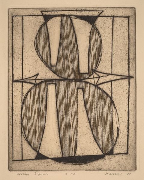 Editor: Here we have Hananiah Harari's "Aeroscape" from 1938, an etching that at first glance feels like a dance between geometric order and something more organic, almost dreamlike. There's a real tension between the crisp lines and the textured washes. How would you interpret this work focusing solely on its intrinsic qualities? Curator: Note the stark contrasts achieved through the etching process. The composition reveals a rigorous arrangement of forms, doesn't it? Observe the squares attempting to contain circles, and how those shapes interact with the softer, cloud-like forms. The diagonal lines cut across the composition, creating dynamic vectors that lead the eye. How do these lines function within the overall structure? Editor: I see, the lines add movement but they also fragment the composition, almost like shattering the illusion of a defined space. It makes it hard to focus on one particular area. What about the tonal range? Is there significance in Harari's restricted palette? Curator: The restricted palette directs our attention to the modulation of tone and texture. Consider how the artist uses light and shadow to define the forms, creating depth and volume where there is only line and surface. This interplay between positive and negative space, black and white, becomes the language of the work itself. The gradations generate aerial perspective to represent an ‘Aeroscape’. Editor: That makes so much sense. I hadn't considered how much depth he creates with so little. It really reframes my understanding of abstraction as something deeply structured, rather than just arbitrary. Curator: Indeed. The artist demonstrates how the formal elements alone can create a compelling visual experience. A true demonstration of formalism at its best.