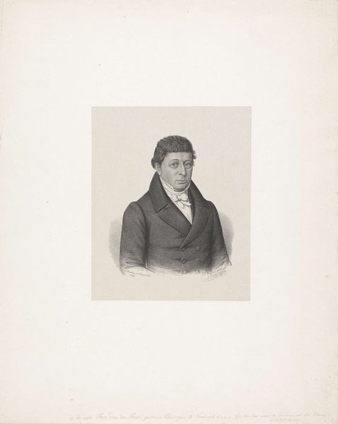 Johann Peter Berghaus created this portrait of J.C. Blom using lithography, a printmaking process that democratized image production in the 19th century. Unlike traditional engraving, which requires laborious carving, lithography uses a flat stone and greasy crayon. The artist draws directly onto the stone, and then, through chemical processes, the design is transferred to paper. This method allowed for a softer, more tonal quality, evident in the subtle shading of Blom's face and coat. The lithographic technique lent itself to mass production, making portraits like this more accessible to a growing middle class. The meticulous detail in the print speaks to the skilled labor involved, even in this relatively "easy" printmaking method. Berghaus’s choice of lithography reflects a shift towards industrialization and a growing market for affordable portraiture, moving away from unique hand-made objects.