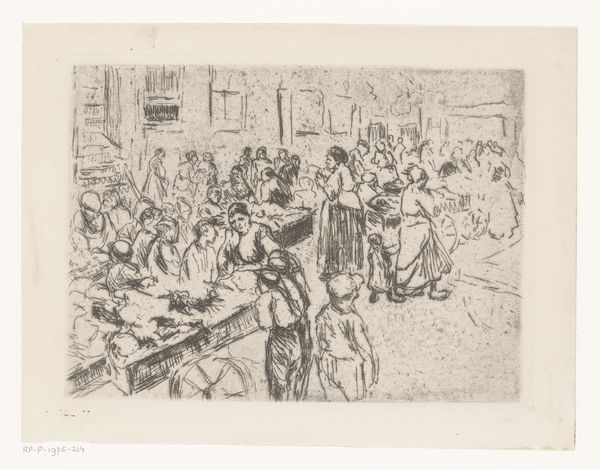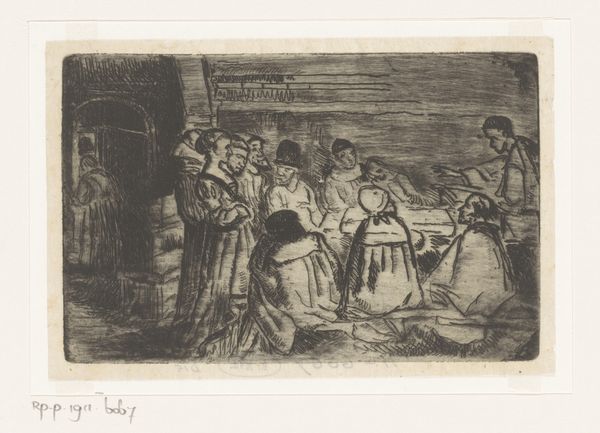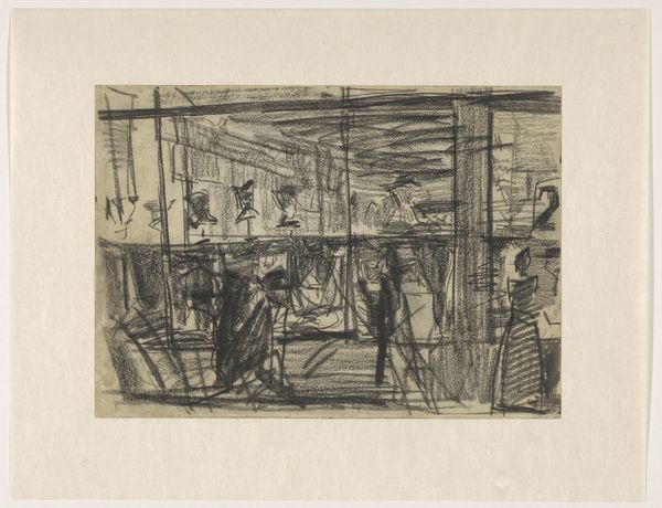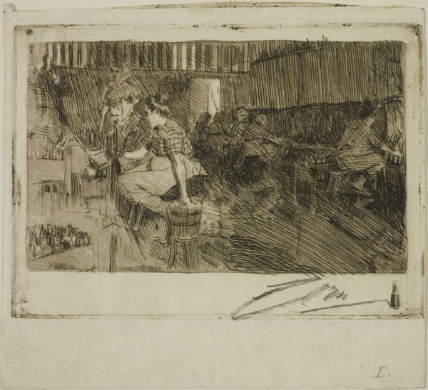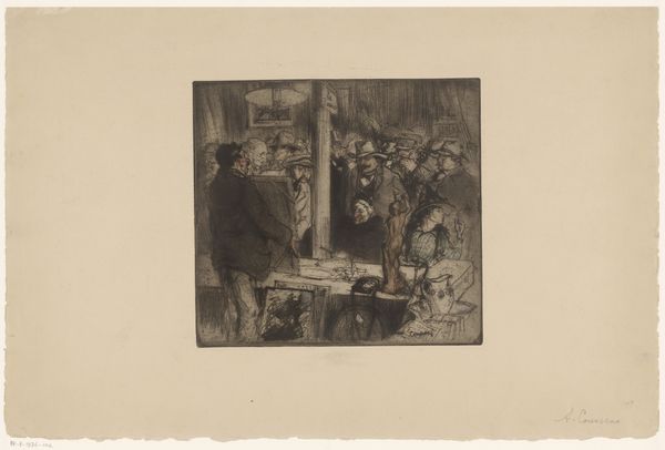 Johannes Löhr made this etching, Interieur van een café, on paper, sometime between the late 19th and early 20th century. The approach to mark-making here feels like an exploration – loose and immediate, as if Löhr is feeling his way through the scene. You can see the barest hint of figures in this interior, and it becomes all the more real. The texture is created by these dense, rapid lines. Look closely, and you see how the density shifts to suggest shadow and form. It’s like Löhr is physically wrestling with the scene, trying to pin down its essence. Those short, scratchy lines are a great example, they suggest the hurried atmosphere of a busy café. There’s a kind of honesty in the way Löhr embraces the messy, provisional nature of artmaking. It reminds me of some of Daumier's lithographs, where the immediacy of the medium is part of the emotional content. Art isn't about answers; it's about opening up questions and possibilities.