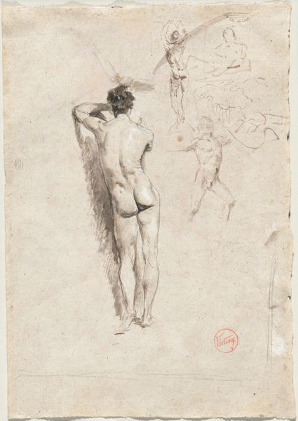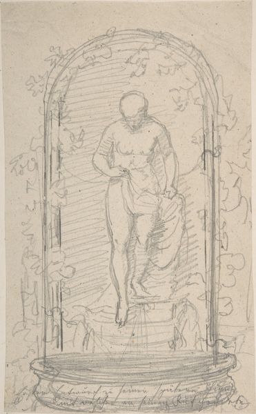 Curator: Today we’re looking at Julian Alden Weir’s etching "Arcturus," created in 1893. It's a striking piece combining the nude figure of a boy with celestial and somewhat dreamlike elements. Editor: Immediately, I sense this fragile, almost melancholic quality about it. The lines are so delicate, as if the whole thing might just dissolve if you look at it too hard. Curator: Indeed. As an etching, it’s fascinating to consider the labour involved. The artist would have painstakingly drawn into a waxy ground on a metal plate, which was then bitten by acid. That tactile, hands-on process is really present. Editor: And those swirling ribbons! They almost feel like… unraveling thoughts, or perhaps a disrupted narrative. Plus, those hanging objects, what are they? This work doesn't explain itself, does it? Curator: No, not at all. Its symbolic nature aligns with the broader Symbolist movement. Weir, deeply immersed in academic art traditions, also embraced some aspects of Symbolism. The inclusion of nude figures against celestial elements nods to mythology but without clear narratives. The dangling elements can be linked to themes of bondage or the passing of time, but their vagueness speaks to Weir's intentions. Editor: Bondage… or burden, perhaps. He stands on what seems like fallen drapery, the future or past crumpled under his feet. It’s this heavy weight set against the almost airy nothingness of space that gives it its charge, don’t you think? Curator: Absolutely. The composition and tonal range further enhance that tension. There's an interplay between the rough sketch-like appearance, achieved through etching, and the smoother, classically rendered human form. Consider how the materiality and process reinforce the intended message. Editor: It’s remarkable how Weir evokes so much ambiguity through such a classical medium. The fragility, the melancholy, it's all woven into the lines themselves. Curator: Precisely, examining Weir’s artistic choices in relation to material, production, and aesthetic intentions provides key insights to its impact. Editor: For me, it is just… haunting. Almost unbearably beautiful in its strangeness.