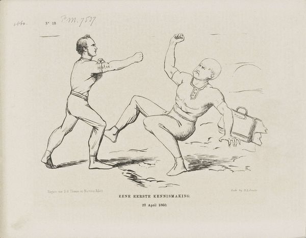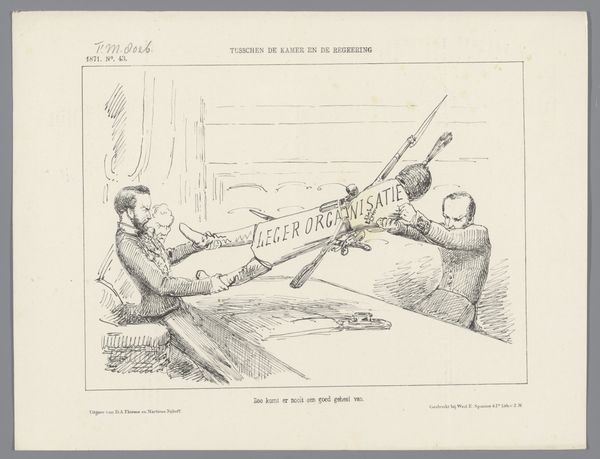 Johan Michaël Schmidt Crans created this print in 1873 as a commentary on the debate surrounding the declaration of war on Atjeh, now Aceh, Indonesia. The composition is striking. On the left, a figure kneels, pulling a rope taut, while on the right, another figure stands poised with an axe raised high. This stark opposition creates a visual tension, amplified by the contrast between the static, grounded posture of the kneeling figure and the dynamic, aggressive stance of the figure with the axe. The linear quality of the print, achieved through delicate hatching, lends a sense of urgency and precision. The sparse background, featuring ships in the distance, anchors the scene in a specific historical context. The axe and rope act as potent symbols: instruments of power and constraint. The print challenges fixed meanings by presenting war as both an act of aggression and a calculated maneuver. The formal elements of line, composition, and symbolic representation work together to create a powerful statement on the complexities and contradictions inherent in acts of war and political maneuvering.