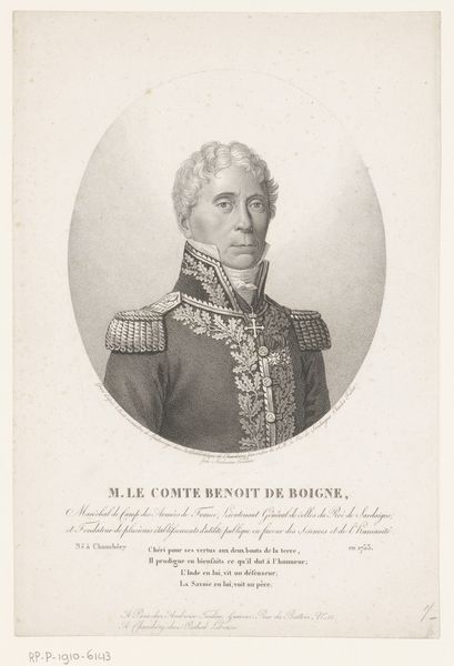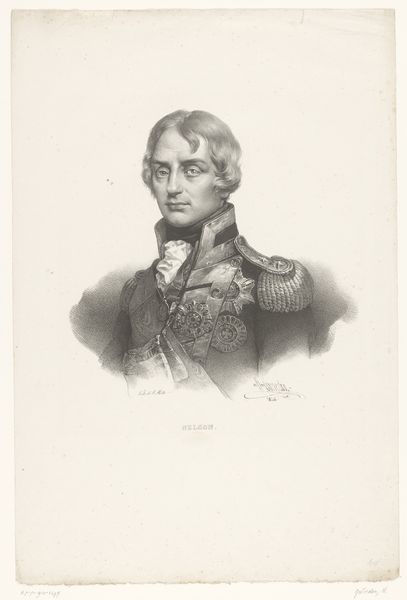 Editor: This is a pencil and graphite drawing entitled "Portrait of Admiral Nelson," dating from 1822-1845 and residing here at the Rijksmuseum. The precision of the shading really gives it a stoic feeling, wouldn't you agree? How do you interpret this work in terms of its artistic construction? Curator: The construction of this portrait relies heavily on chiaroscuro. Notice the sharp contrast between light and shadow which sculpts Nelson's face and emphasizes the details of his uniform. What effect do you think this intense shading creates? Editor: Well, it definitely adds dimension, but it also seems to highlight the weight and responsibility on his face. Is it fair to say the artist skillfully rendered the materiality of his garments, adding visual weight? Curator: Precisely! The graphite meticulously captures the texture of the fabric, the gleam of the medals, all contributing to the overall gravitas. Moreover, consider the composition itself. The subject occupies the majority of the frame, but do you see how the background fades almost into nothingness? This directs the eye squarely on Nelson and the symbols of his rank. The formal elements clearly dominate in constructing this artwork. Editor: That's fascinating! I hadn't considered the background, and its effective flatness to showcase Nelson. Seeing how all these features work in conjunction has given me an excellent new angle to think about. Thanks! Curator: Indeed. Considering the formal elements, like the relationship between foreground and background or the way light and shadow defines the figure, truly unveils how the artist constructs the meaning.