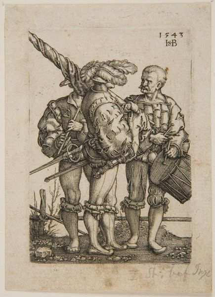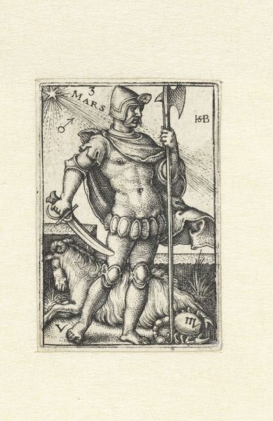 Sebald Beham created this intricate engraving, "Mercurius met sterrenbeelden Maagd en Tweelingen," sometime between 1500 and 1550. The composition is dominated by the figure of Mercury, positioned centrally and vertically. Beham uses dense, parallel lines to create texture and shading, giving form to Mercury’s body and the drapery that falls behind him. The dense hatching creates a compelling contrast between light and shadow. The linear quality of the engraving emphasizes form, but also subtly evokes a sense of movement. The symbols are not merely decorative; they act as signs within a complex visual language. Consider how Beham uses line and form to create a symbolic representation of Mercury. This engraving is a cultural artifact, which continues to invite new interpretations through its complex interplay of form, symbol, and cultural context.