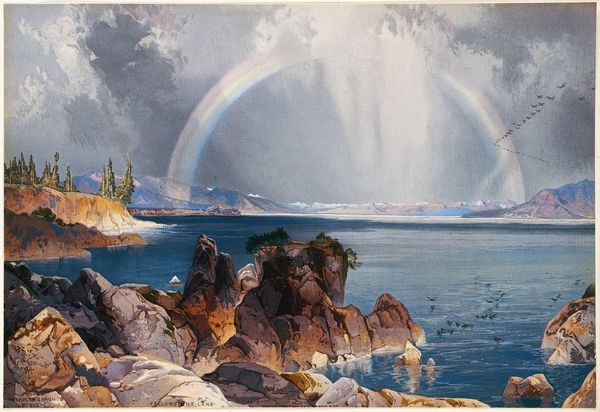Curator: What a majestic scene. This is "Great Falls of Snake River, Idaho Territory," a watercolor created by Thomas Moran around 1876. Editor: It certainly grabs you, doesn't it? That dramatic sky pressing down on the scene really sets the mood. And those whites of the water against the darker hues – the contrast is striking. Curator: Moran was quite deliberate in how he presented the American West. Think about the timing: westward expansion, the railroad, Manifest Destiny…he was painting an idea of the sublime, a promise of untapped potential. His artwork visually promoted settlement. Editor: Absolutely, it’s promoting. Visually, he uses contrast of scale, too: these foreground rocks – so substantial – set against the immensity of the falls, amplifying nature's power and...dare I say it, encouraging viewers to appreciate their potential insignificance. Curator: It's also interesting to note the indigenous peoples are absent. Although, Native Americans lived there for thousands of years. This omission suggests land available, ready to be conquered and enjoyed for industrialization and other capitalistic activities. It idealizes colonization by romanticizing it. Editor: I see your point, and it cannot be denied that they are unrepresented. But observe how skillfully he creates the illusion of depth, pulling us into the scene. That aerial perspective as the plains extend away into the distance really suggests both infinite space and the capability to imagine crossing it. Curator: Of course. However, it's essential to remember that the 'frontier' wasn't empty, nor free. It makes a visual statement aligned with that historic land appropriation and subsequent reshaping of indigenous cultures. Editor: Understood. Perhaps that's why there is also something…overwhelming… about this picture; I wonder if that tension comes from a deep historic cause? Curator: Very possibly. We have come a long way as a country in reckoning with historical and contemporary socio-political issues, but artwork like this certainly documents an historic part of how the American West came to be as perceived then and today. Editor: This journey through its structure and symbolism shows me just how evocative visual art is when contextualized for people with information. Thank you.