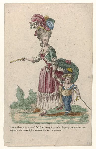 Curator: This print from 1780, "Gallerie des Modes et Costumes Français", is by Charles Emmanuel Patas and part of a series documenting French fashion. The medium combines etching and delicate watercolor. What strikes you first about it? Editor: The interplay of mauve and the height of the hat! It's wonderfully, terribly, exuberant. But the monkey adds a sort of, uneasy counterpoint. Curator: The monkey in such images can't be separated from its roots in the orientalist fantasies so prevalent in France at this time. Think about what it means to represent enslaved people as animalistic creatures or luxury objects in these domestic scenes. The fashionable lady teasing the animal only enforces the notion of a vast divide separating them, reifying the social structures of colonialism. Editor: Certainly. However, note how the line traces every detail of fabric—the cascading gathers of her robe à la française. I think there's a structural interest here that overrides, in the immediate sense, social commentary. Look how the light defines each plane, lending weight and texture to the silks and taffetas. Curator: But isn't that emphasis on surface itself a political choice? In portraying her with such extravagance, aren't we meant to also acknowledge the underlying class divisions of pre-revolutionary France and its overseas extraction of raw goods by brutal force? How complicit are images of pleasure? It begs us to consider questions of wealth, social status, and cultural appropriation, which cannot be detached from broader power dynamics. The visual appeal serves to mask an inherently unequal arrangement. Editor: Perhaps. But does it then become impossible to simply observe the formal excellence of a print as a thing of beauty in its own right? I am drawn back to that hat! The line and tonality, the contrast… Curator: These objects themselves, though, are loaded, a reflection of a certain mentality. Can an image truly divorce itself from its history? Editor: Probably not entirely. Perhaps a deeper understanding comes from holding both perspectives at once. Curator: An enriched perspective, definitely, with a more complete understanding.