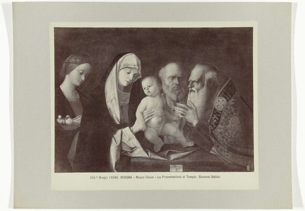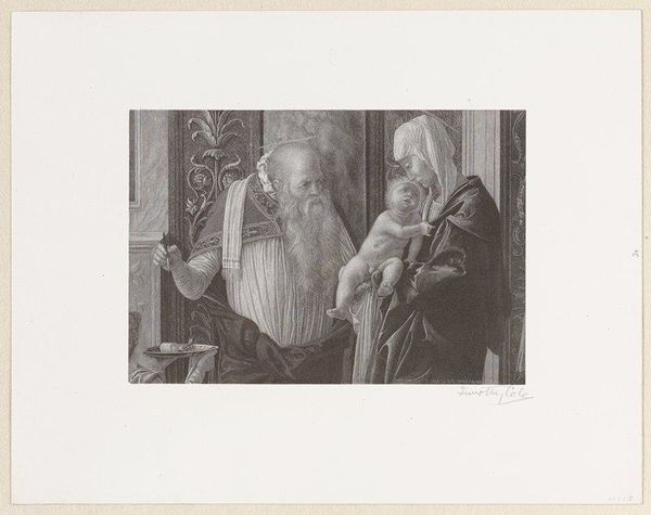 Editor: This is Timothy Cole’s "Adoration of the Kings," made in 1889. It's a wood engraving. What strikes me most is how timeless and serene it feels, despite being rendered in such a graphic style. What catches your eye about this print? Curator: I am drawn to the halos. They serve not merely as symbols of divinity, but as signifiers of a continuous, shared cultural memory. The circle, an ancient symbol, represents wholeness and eternity. What effect do you think that those symbols have on our reading of this work as an historical rendering of religious narrative? Editor: I see what you mean. They kind of bridge the gap between then and now, don’t they? We recognize them instantly as religious, but I suppose without them, it would be harder to place or interpret the scene. Curator: Precisely. Consider the attentive expressions. They mirror our own yearning for connection with something greater, an almost universal human experience across time. The image of adoration persists as a testament to this deep-seated desire for transcendence and meaning. Do you think we can extend the symbolism to include non-Christian cultures? Editor: Hmmm, good question. It is something innately and universally human to "adore," in one's own personal way. It makes me wonder about different images of leaders and divine figures across various religions and cultures. Curator: Indeed, the visual language of devotion—whether through posture, gaze, or offering—speaks across cultural boundaries. Images like this function as powerful reminders of our shared human search for the sacred. What would you say that you've taken away from looking closely at those different perspectives? Editor: That understanding of shared, universal desires and their symbolic representations definitely deepens my experience. Curator: Likewise, it enriches my own viewing, especially to learn how images resonate with new audiences, reminding us of the enduring power of visual storytelling.