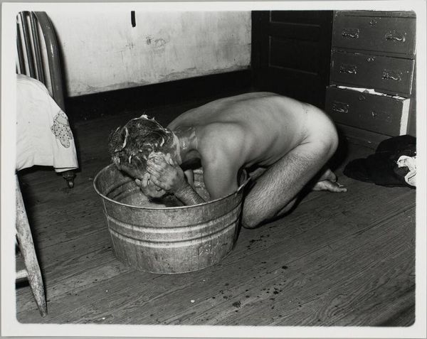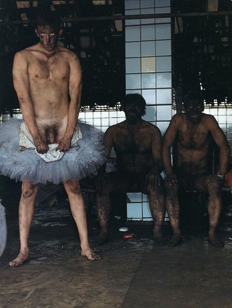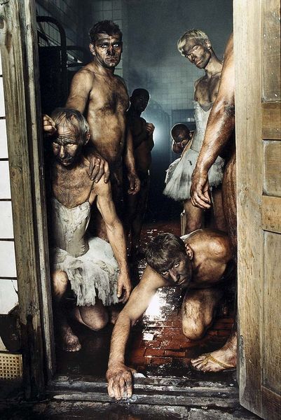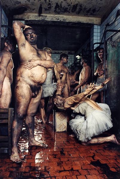 Curator: Arsen Savadov's photograph, "Donbass Chocolate," made in 1997, presents a striking juxtaposition of masculine labor and feminine attire. The figures are caked in what appears to be a thick, dark substance, their expressions intense. What's your first reaction to this image? Editor: My immediate impression is one of profound discomfort. The grimy bodies combined with the delicate tutus create an unsettling tension, a sort of visceral clash that really gets under my skin. I'm already thinking about the performative aspect of labor and how it shapes identity. Curator: Precisely. Savadov created this tableau vivant by photographing male coal miners covered in coal dust, some adorned in ballet tutus. This visual paradox challenges conventional gender roles within the context of the Donbass region's coal-mining culture. Editor: The title itself, "Donbass Chocolate," is intriguing. The phrase brings to mind both industry and labor but then ties that directly to consumable commodities, almost like branding the human cost. How much did this performance actually play with notions of commodity? Curator: That’s a compelling question. By combining hyper-masculine and hyper-feminine elements, it creates a potent social commentary, exploring identity as something manufactured and performed, like any other material good. Editor: Absolutely, and you can’t overlook the material presence of the coal itself. It’s not just a backdrop; it’s on their skin, almost becoming a second skin, a suffocating layer that transforms their appearance. It makes me think about the actual physical labor. What kind of work do they really perform? What kind of environment surrounds that labor, and what is the product that arises? Curator: It's powerful how the piece makes us consider not just the act of mining itself but the complex social and political structures built around it, particularly in post-Soviet Ukraine, which had a very troubled recent past. Editor: It’s fascinating to consider how Savadov utilizes performance as a medium to expose the raw, material conditions of work and identity construction. He asks us to critically examine the narratives we construct about masculinity, labor, and the economy. Curator: "Donbass Chocolate" leaves us pondering the multifaceted nature of identity, forcing a confrontation between ideals and the gritty realities that define them. Editor: Yes, it makes you wonder who profits, what is wasted, and at what price. An unsettling but extremely evocative piece!