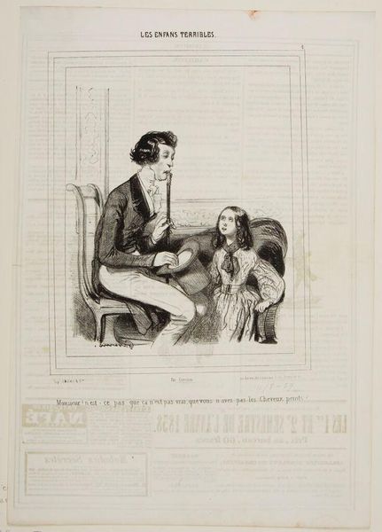 Curator: This print by Paul Gavarni, poignantly titled "A baby! a baby, sir, and I believed myself right up until yesterday the first and only love," strikes me as wonderfully melancholic. Editor: I agree, there's a theatrical sadness here, almost as if the man is performing his sorrow. The two hats left abandoned suggest something left behind or lost. Curator: Absolutely, the hat as a symbol of status and identity! Its abandonment speaks volumes about the character's inner turmoil. But notice the woman's gesture; she seems almost to be giving a direction, which is the symbol of power over him. Editor: Maybe the direction is to grow up! This composition isn't just about romantic betrayal; it's a snapshot of societal roles and expectations. Curator: Perhaps. Gavarni captures how love and identity can be so intertwined and easily shattered. Editor: Indeed. It makes you wonder what we leave behind when love changes its course.