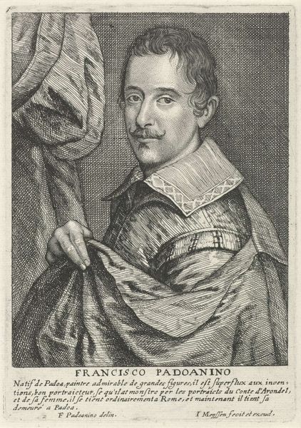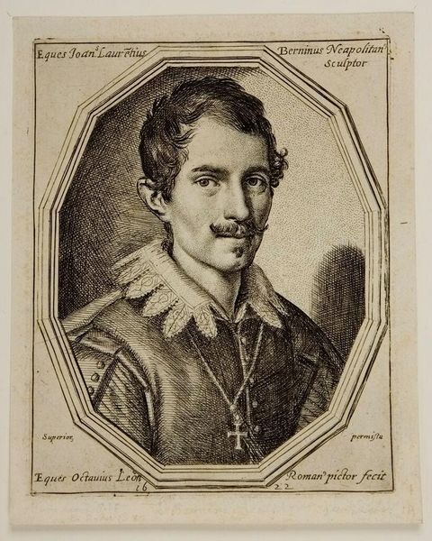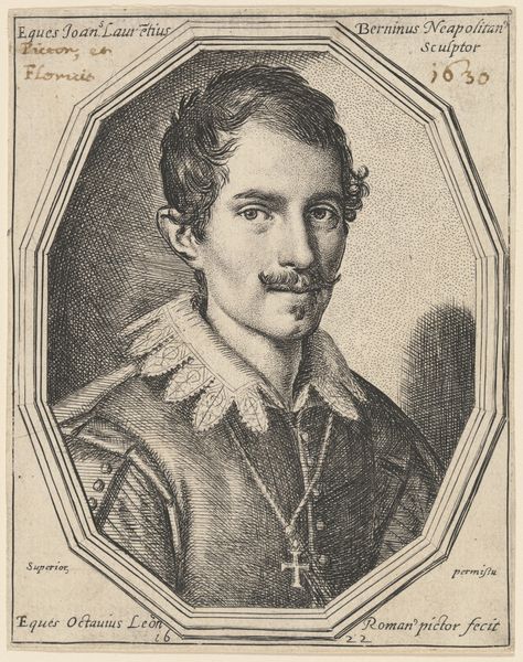 Curator: This is Ottavio Leoni's portrait of Gian Lorenzo Bernini. Editor: He looks rather serious, doesn't he? Almost melancholic, but also incredibly self-assured. It's like looking into the eyes of burgeoning genius, trapped in amber. Curator: Indeed. Leoni, who lived from 1578 to 1630, captured a young Bernini, then on the cusp of revolutionizing sculpture. Notice the crispness of the line work; it really defines his features. Editor: And that collar! It's a statement piece. Beyond fashion, it suggests a separation, almost an intellectual distance from the world. Do you think that resonates with Bernini's later work? Curator: Absolutely. Symbols of status aside, the cross around his neck points toward the deep religious fervor of the Baroque period, which Bernini came to embody. Editor: It’s a potent reminder that even revolutionary artists are rooted in the visual languages of their time. Curator: Exactly. A fascinating interplay, wouldn't you agree? Editor: A perfect portrait of potentiality and power.