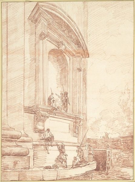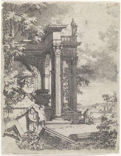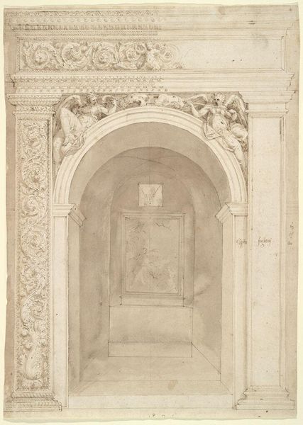 Editor: So, this is "Romeinse triomfboog," a pen and ink drawing by Willem Romeyn, made sometime between 1634 and 1694. I'm struck by how the detail of the arch contrasts with the openness of the landscape in the background. What do you see when you look at this piece? Curator: It is intriguing, isn't it? Ignoring any narrative suggestions, what strikes me most is the masterful control of line and the tonal variations achieved through hatching and cross-hatching. Consider how the artist delineates the arch itself, using heavier lines to suggest depth and shadow, contrasting with the much lighter treatment of the background elements. Editor: The way you focus on the line work makes sense. It almost feels like I’m looking at blueprints, like a study of form before anything else. But why isolate it from history? Isn't a triumphal arch inherently…historical? Curator: Indeed. Yet, by focusing on its formal qualities – its lines, textures, and the interplay of light and shadow – we gain insight into the artist’s process and intent. Consider the careful rendering of the geometric shapes. Note the aged paper with its almost gold-looking patina, this is only contrasted with the pen strokes on the Arch. Romeyn's interest is more geared towards the underlying structure than its original function. Editor: I guess by thinking about how the shapes work, it takes the object out of its past. Now, it feels less like an emblem and more like… geometry. Curator: Precisely! The visual elements take precedence, encouraging a contemplative experience separate from any predetermined historical context. The drawing transcends mere representation. Editor: That's given me a fresh appreciation for seeing it as more than just a historical document. Thanks for showing me that a closer look at lines and forms helps decode the image in surprising new ways. Curator: My pleasure! It is through this constant questioning of form and its relationship to space that we reveal the artwork's full potential for interpretation.