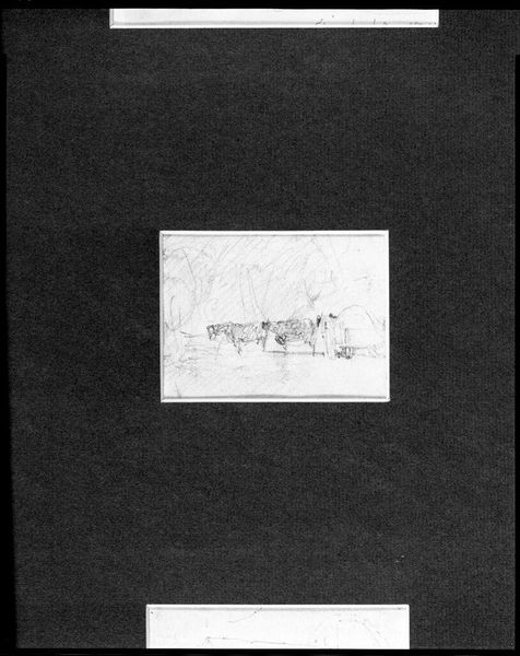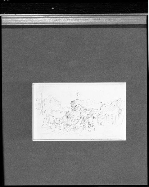 Editor: This is George Chinnery's "Oriental Scene," a pen and ink drawing. The sketchiness gives it a sense of immediacy. What strikes you about its composition? Curator: Note the artist's sophisticated use of line and mass. Observe how the structural elements – the verticality of the tower, the horizontal emphasis of the building, and the organic form of the tree – create a dynamic tension. How does this interplay affect your reading of the work? Editor: I see how those contrasting lines add depth. Thanks!